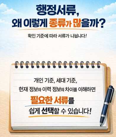 행정서류의 구분은 대부분 확인 단위와 정보 범위에서 시작됩니다. 행정기관이 어떤 사실을 확인하려는 지에 따라 개인을 기준으로 볼 것인지, 세대를 기준으로 볼 것인지가 달라지고, 현재 상태만 필요한지 아니면 과거 이력까지 확인해야 하는지도 달라집니다. 이러한 차이를 반영하기 위해 행정서류의 형태가 나뉘어 있습니다. 예를 들어 주소 확인이 목적이라면 현재 정보만 담긴 서류로 충분한 경우가 많습니다. 반대로 거주 이력이나 변동 과정이 중요한 상황에서는 과거 정보까지 포함된 서류가 필요해집니다. 행정서류는 이런 행정 목적을 충족하기 위해 구조적으로 구분된 것입니다.